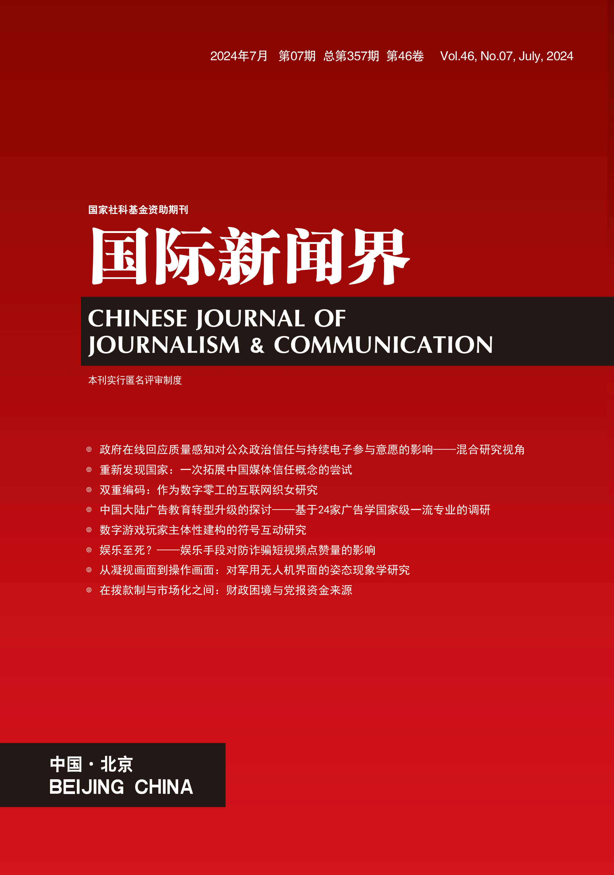 当前,娱乐化的表达方式正逐渐占据公共领域,通过娱乐手段提升传播效果似乎已成为共识,但娱乐是否一定能促进传播效果尚需进一步的研究。本研究以防诈骗短视频作为研究语境,以详尽可能性模型和一致性理论作为理论基础,通过对抖音上467个防诈骗短视频的内容分析,探究议题和媒介属性如何调节娱乐化对点赞量这一传播效果指标的影响。结果显示,防范教育和揭秘骗术信息抑制了娱乐化对点赞量的促进作用,但案件描述和财产损失信息强化了娱乐化对点赞量的提升效果。自媒体使用娱乐手段能显著提升点赞量,且这一效果不受任何类型信息的影响,但官媒的点赞量不受娱乐化影响。本研究不仅为使用娱乐手段进行公共传播提供了策略,还解释了娱乐化对传播效果的影响边界,对泛娱乐化背景下受众和媒体间的关系提出了新的解释。